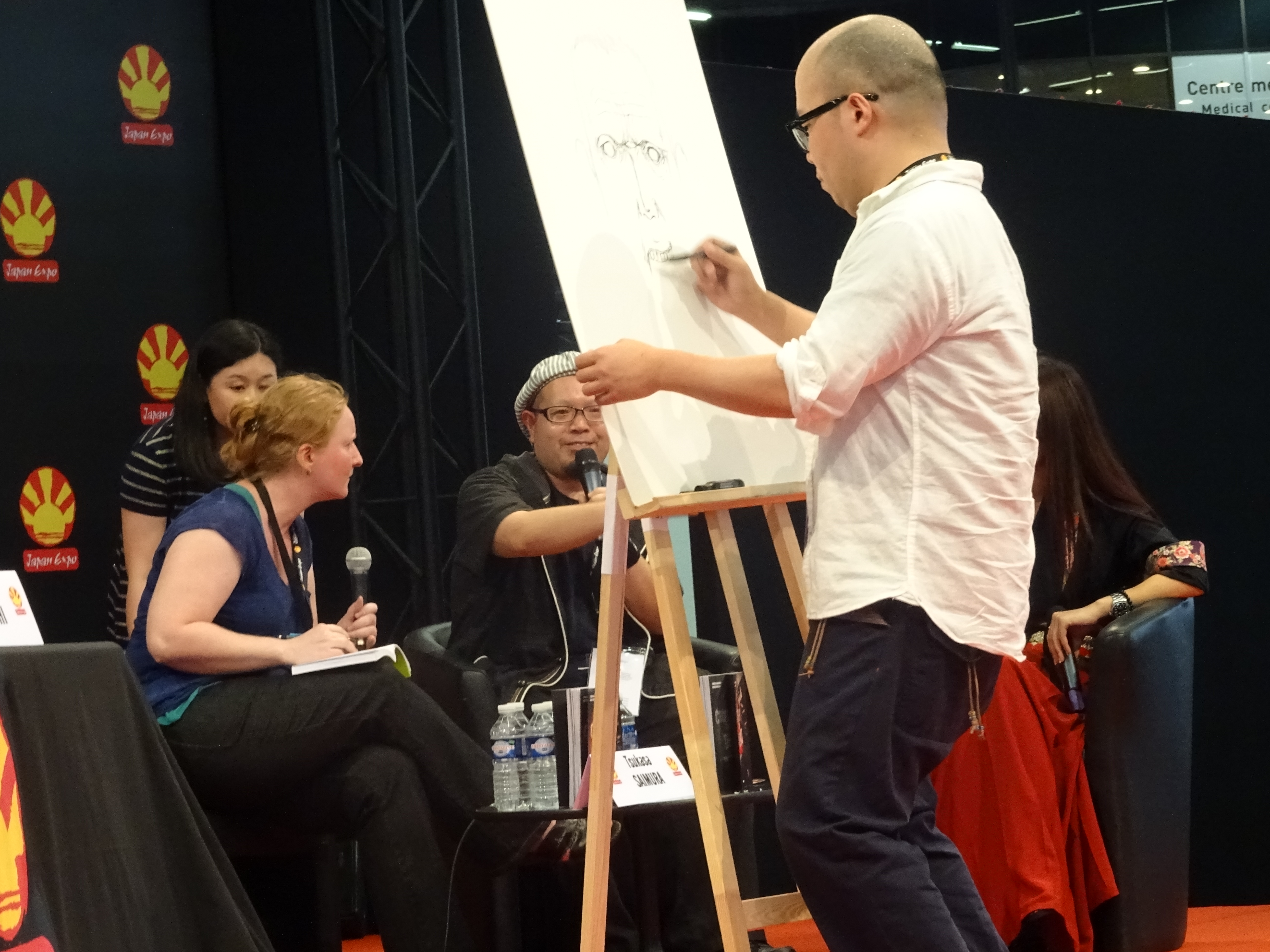 Parmi les presque 100 kilomètres carré d’exposition, il y avait de nombreux stands dont certains s’apparentant à l’art du dessin. On pouvait y acheter des toiles, des peintures ou même des croquis de nos portraits, réalisés en direct. Nous avons pu assister à une conférence en direct avec l’auteur du nouveau manga : Crueler than dead. Le scénariste, Saimura Tsukasa, répondait aux questions posées par une journaliste et par le public, pendant que Takahashi Kôzo, le dessinateur, réalisait un portrait d’un zombie en direct.